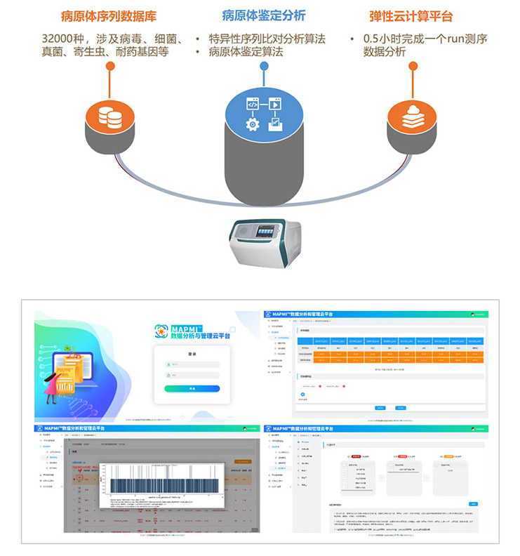 MAPMI®数据分析与管理云平台包括数据分析管理系统和报告解读系统。数据分析管理系统通过自建高质量全类型的病原参考数据库,实现对16,109种病毒、13,362种细菌、1,659种真菌、270种寄生虫和2,500种耐药基因的准确检测分析,并通过云计算技术实现了30分钟内完成一个run(约80GB)测序数据的快速并行分析。MAPMI®数据分析算法在多种类型临床样本中均具备良好的灵敏度和特异性,尤其适用于急危重症和疑难感染样本的分析与辅助诊断。报告解读系统通过对数据分析结果的整合统计分析,实现了样本信息管理、交叉污染判定、阳性病原体指标筛选和审核、临床检测报告生成等功能。