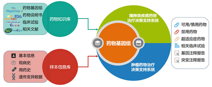 药物基因组学以功能基因组学和分子药理学为基础,结合药代动力学和药效动力学,分析遗传变异对药物反应的影响,有助于指导临床医生根据患者个体遗传特征选择适当的药物剂型和用药剂量,获得最优化的临床用药指导。药物基因组学数据平台主要解决了基于患者个体遗传信息,进行精准用药解读,从而辅助医生选择最优的治疗方式。目前,药物基因组学数据平台包含两个主要的应用方向,肿瘤药物治疗决策支持系统和精神类疾病精准用药解读系统。